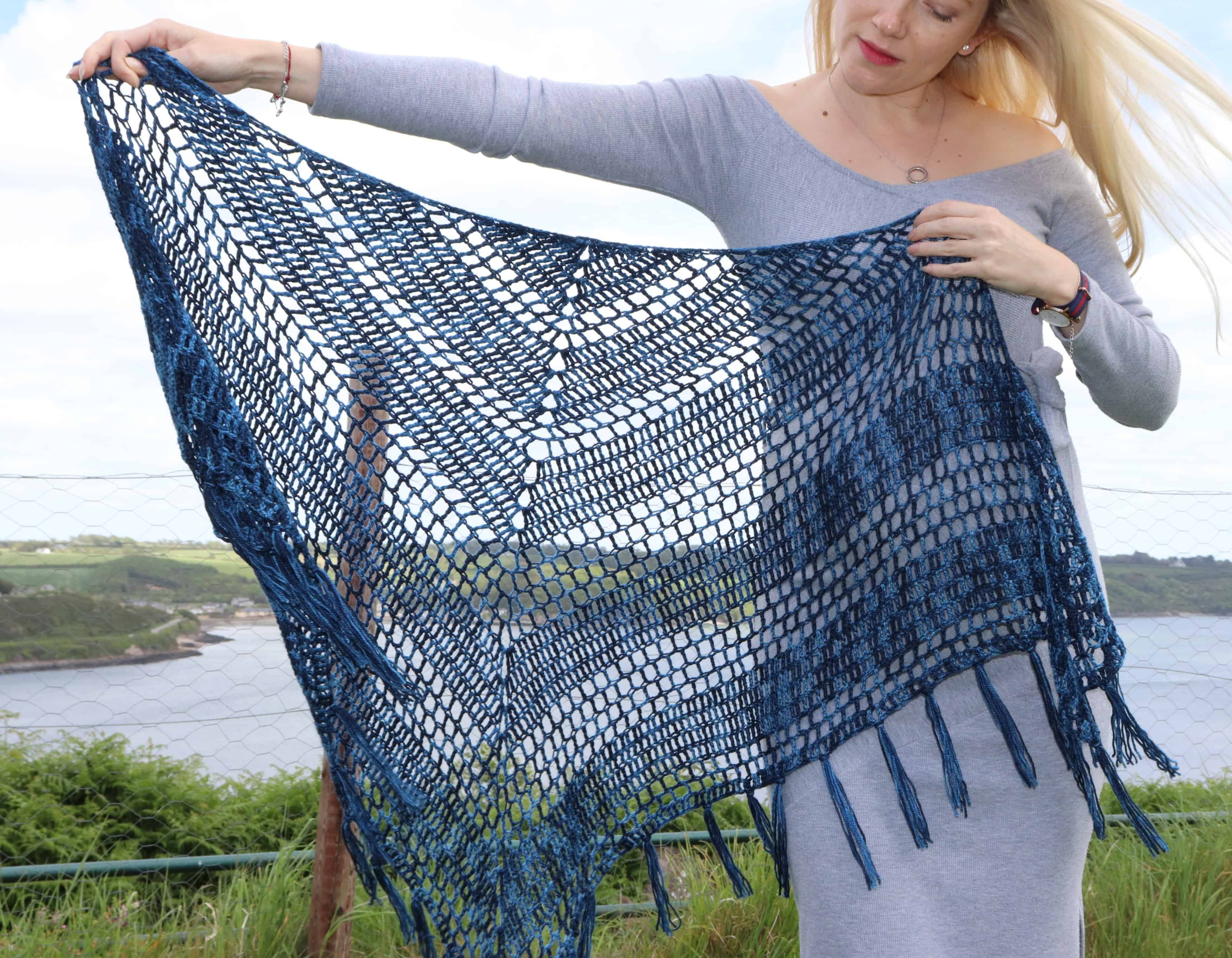 This asymmetric triangle shawl uses just one stitch throughout, the herringbone double crochet, which gives it a subtle, elegant texture. The most solid stitch pattern in this collection, this shawl keeps it summery with fingering weight yarn and a coastal color scheme.