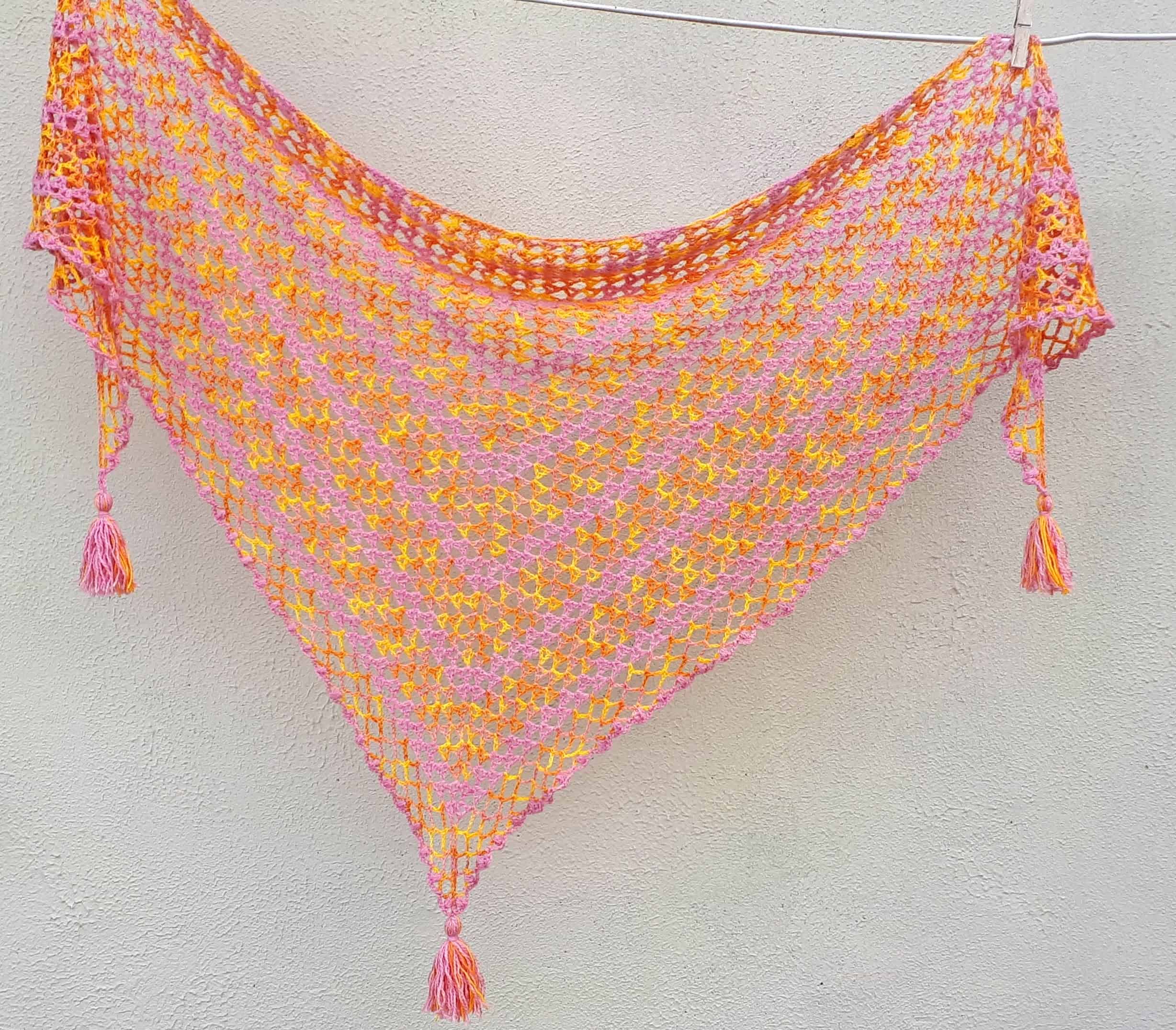 This cheerful crochet shawl is perfect to make and wear in the summertime! A photo tutorial is provided for the first four rows to help you get started with this easy shawl pattern. Once you get going, this becomes a meditative project—one you can take on holiday or work while relaxing in the garden. The pattern requires 400m (100g) of one color of fingering weight yarn and 70g of a contrasting color.